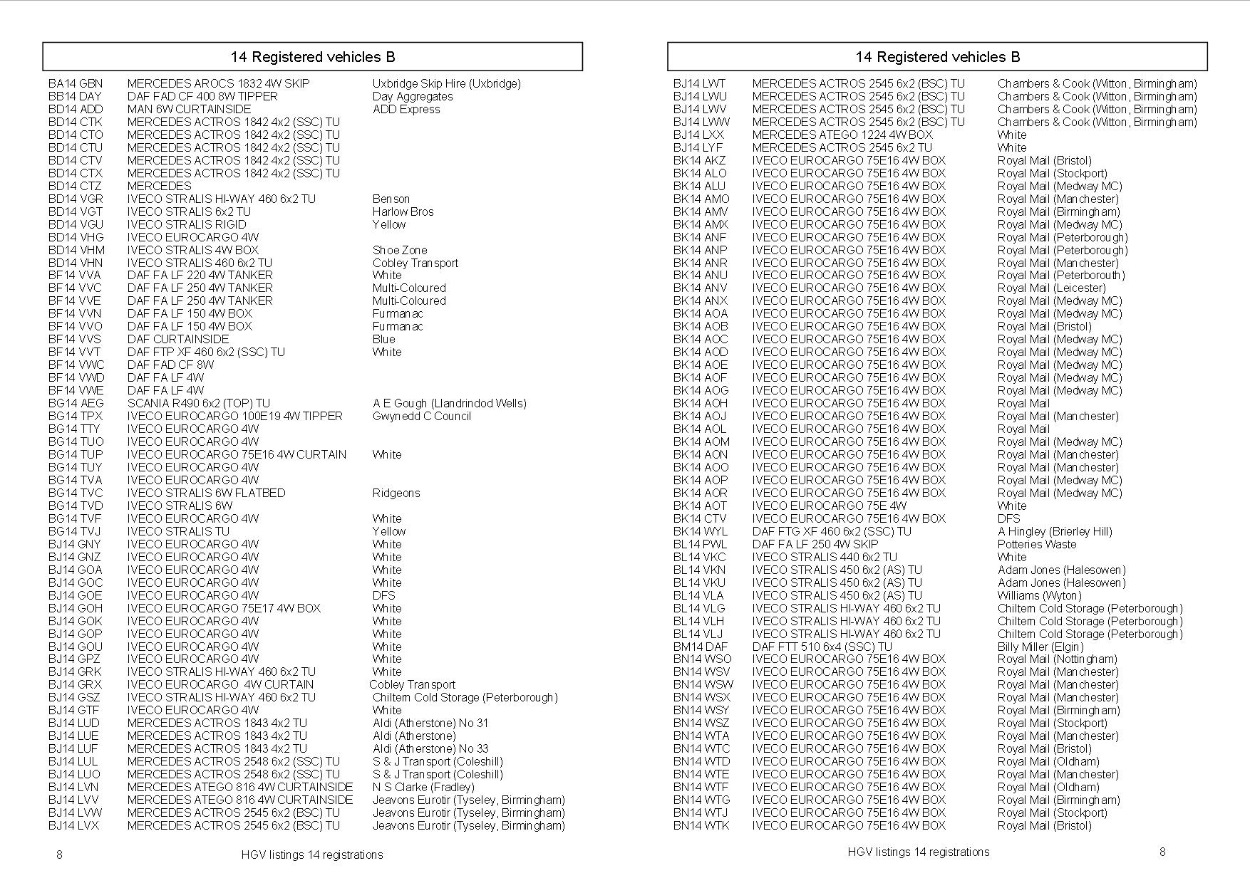 This is the second of a new set of four brand new books listing the registrations of the UK`s HGV fleet. Vehicles are listed in registration number order, together with the vehicle manufacturer and the current owner (if known), or if not, the present livery. Fire engines and Council vehicles are also included. Other than subsequent scrappings, these books will require little updating by the user and can therefore be used for years to come! This volume covers 14 registrations of which over 10,000 are listed.