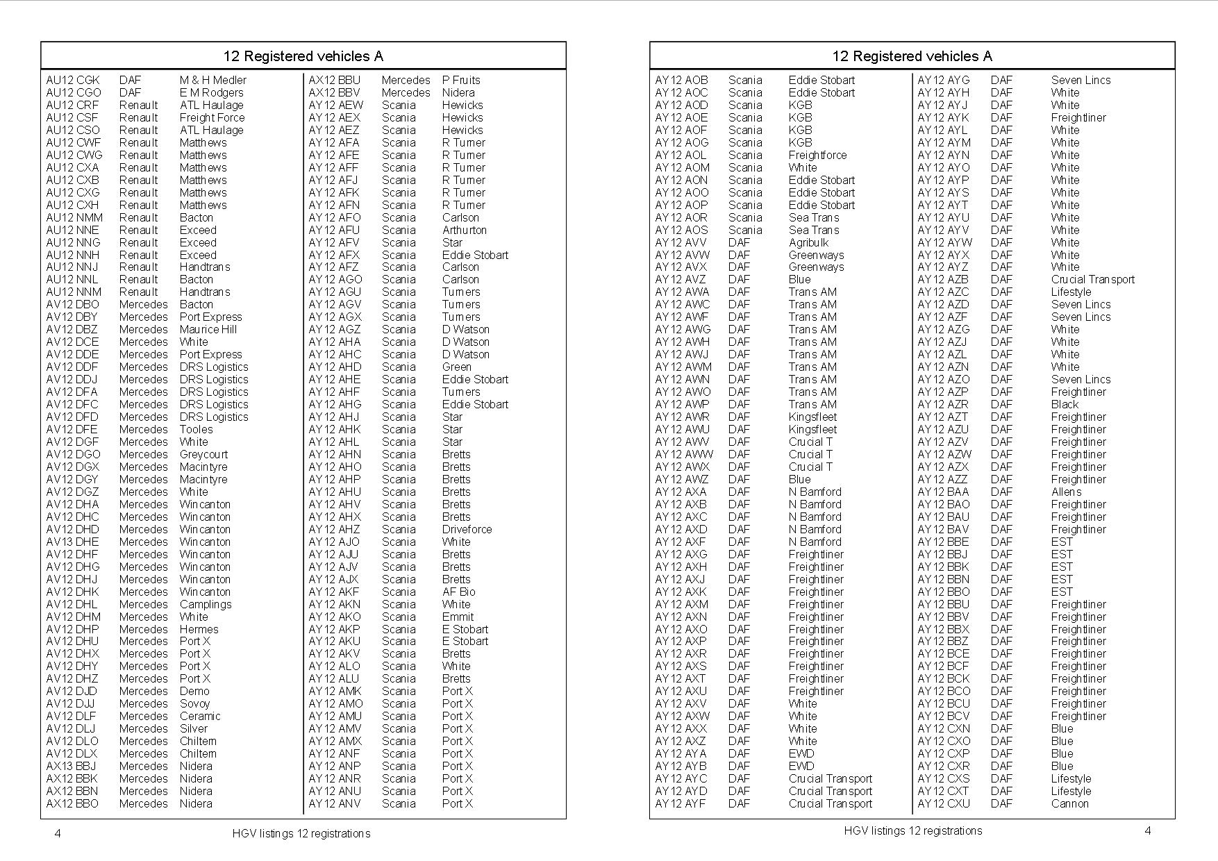 This is a further volume in our new series of books listing the registrations of the UK`s HGV fleet. This volume covers the 12 series registrations, and as with the previous volumes, vehicles are listed in registration number order. Also shown is the vehicle manufacturer and the current owner (if known), or if not, the present livery. Fire engines and Council vehicles are also included. Other than subsequent scrappings, these books will require little updating by the user and can therefore be used for years to come! This volume contains 14,125 registrations.