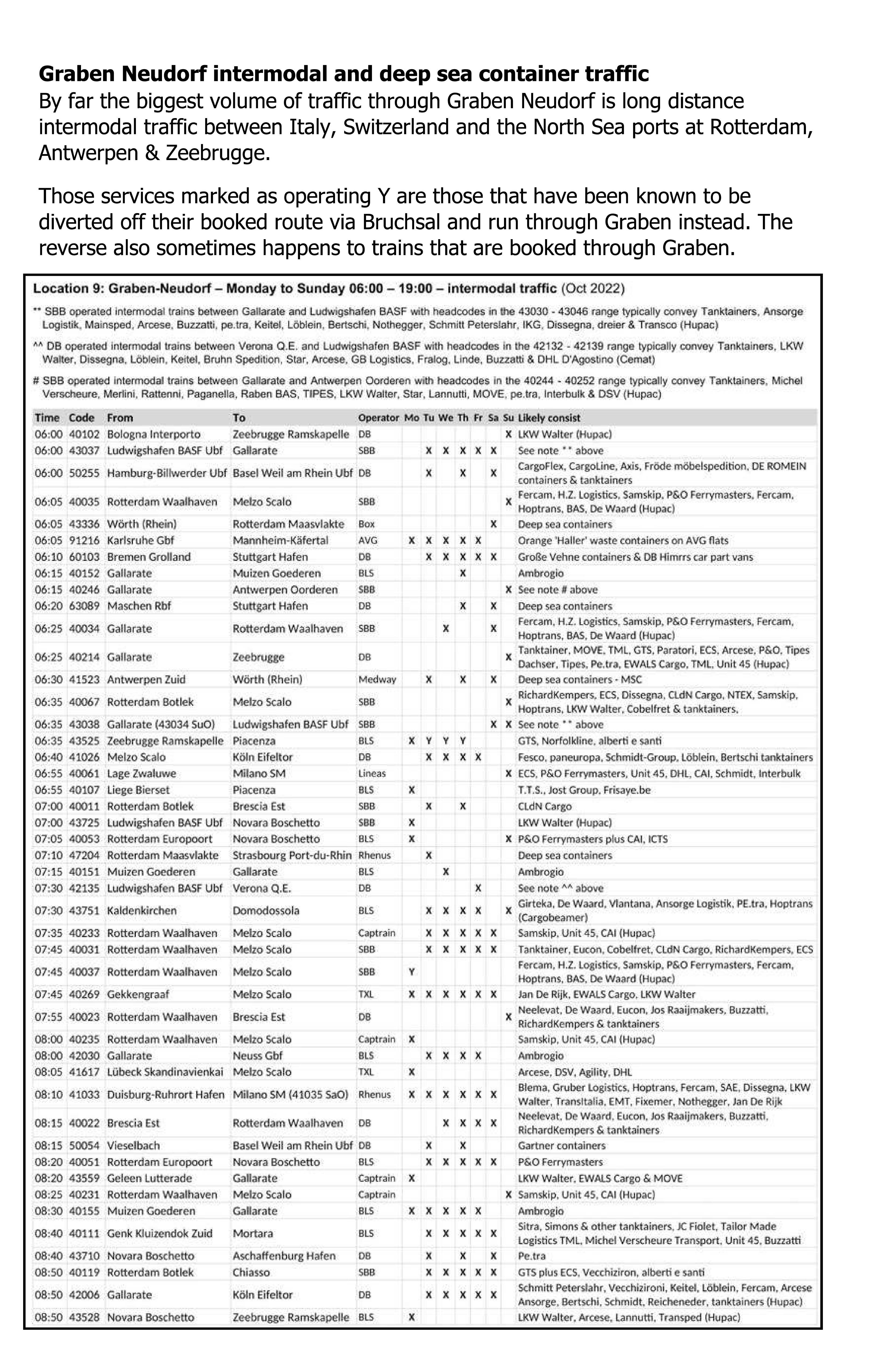 arrival and departure times at all yards and terminals including the busy yards at Gremberg, Mannheim, Mainz Bischofsheim and Karlsruhe.